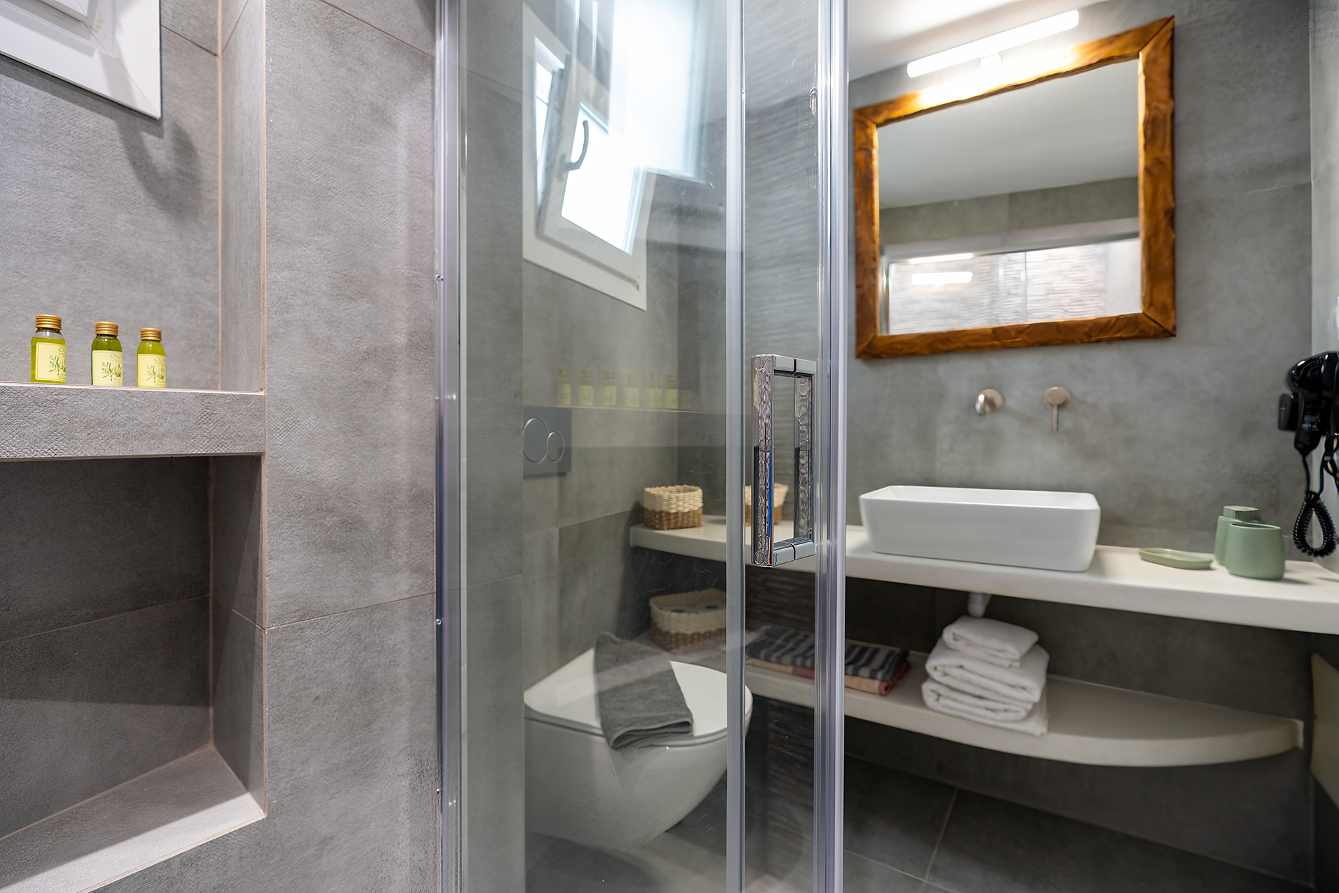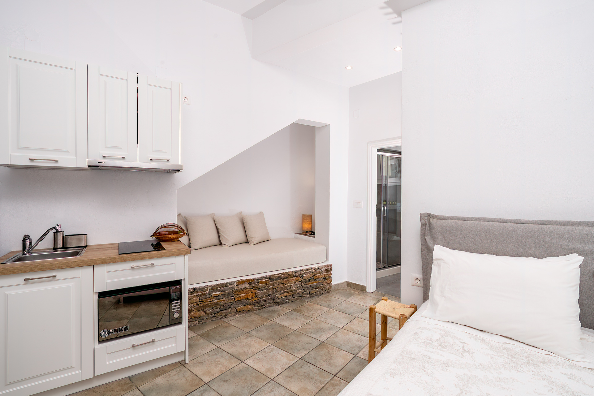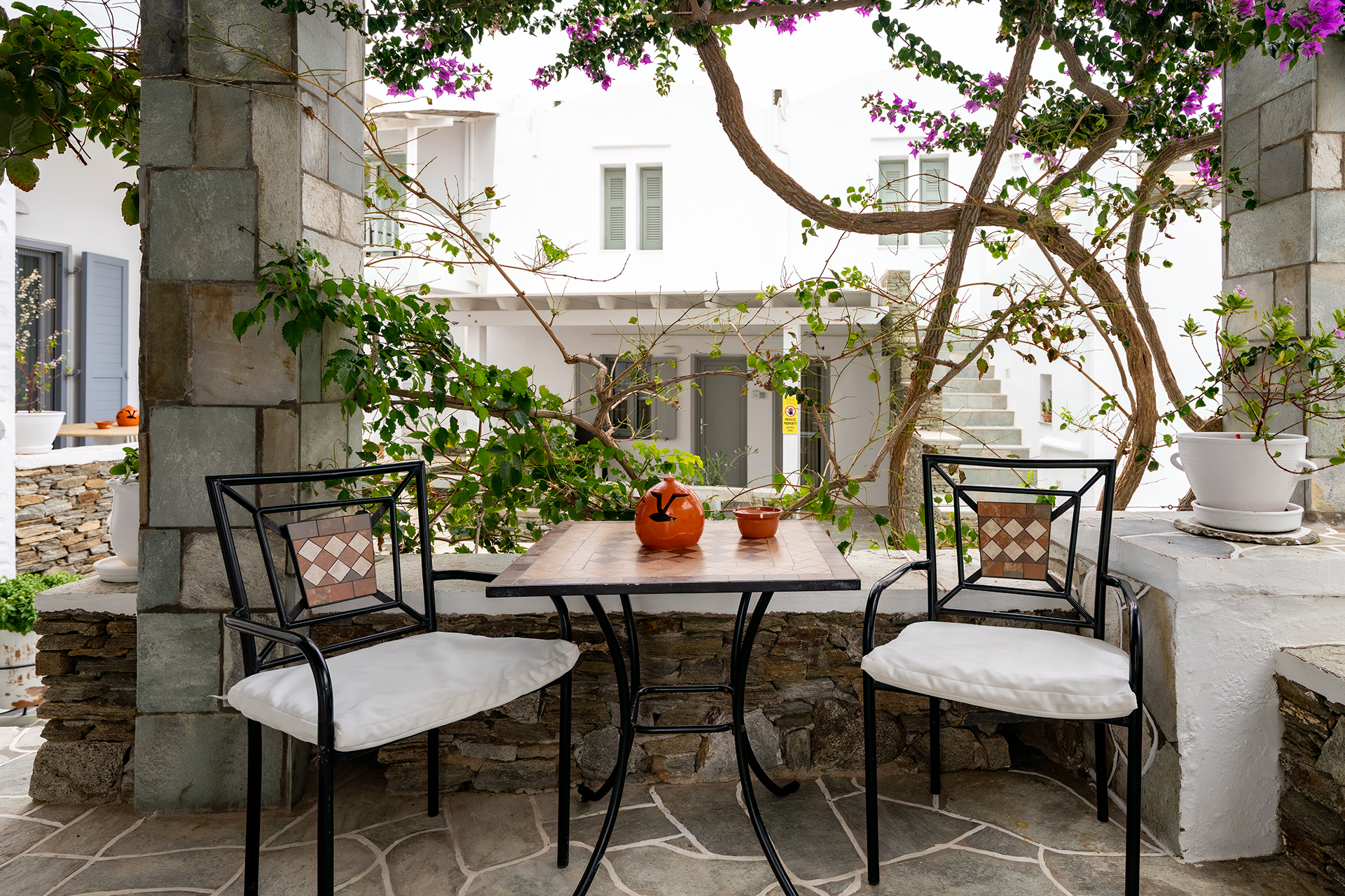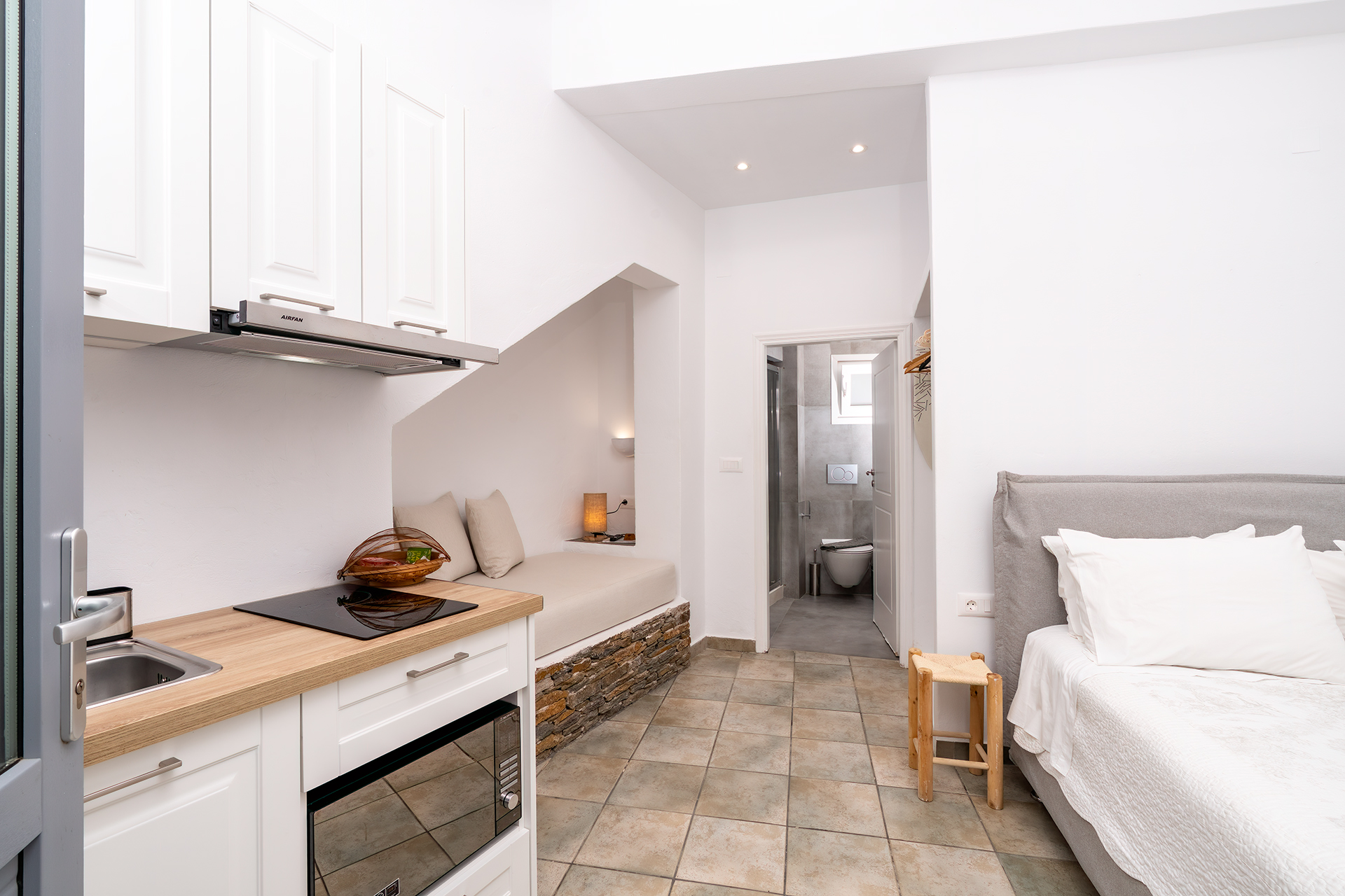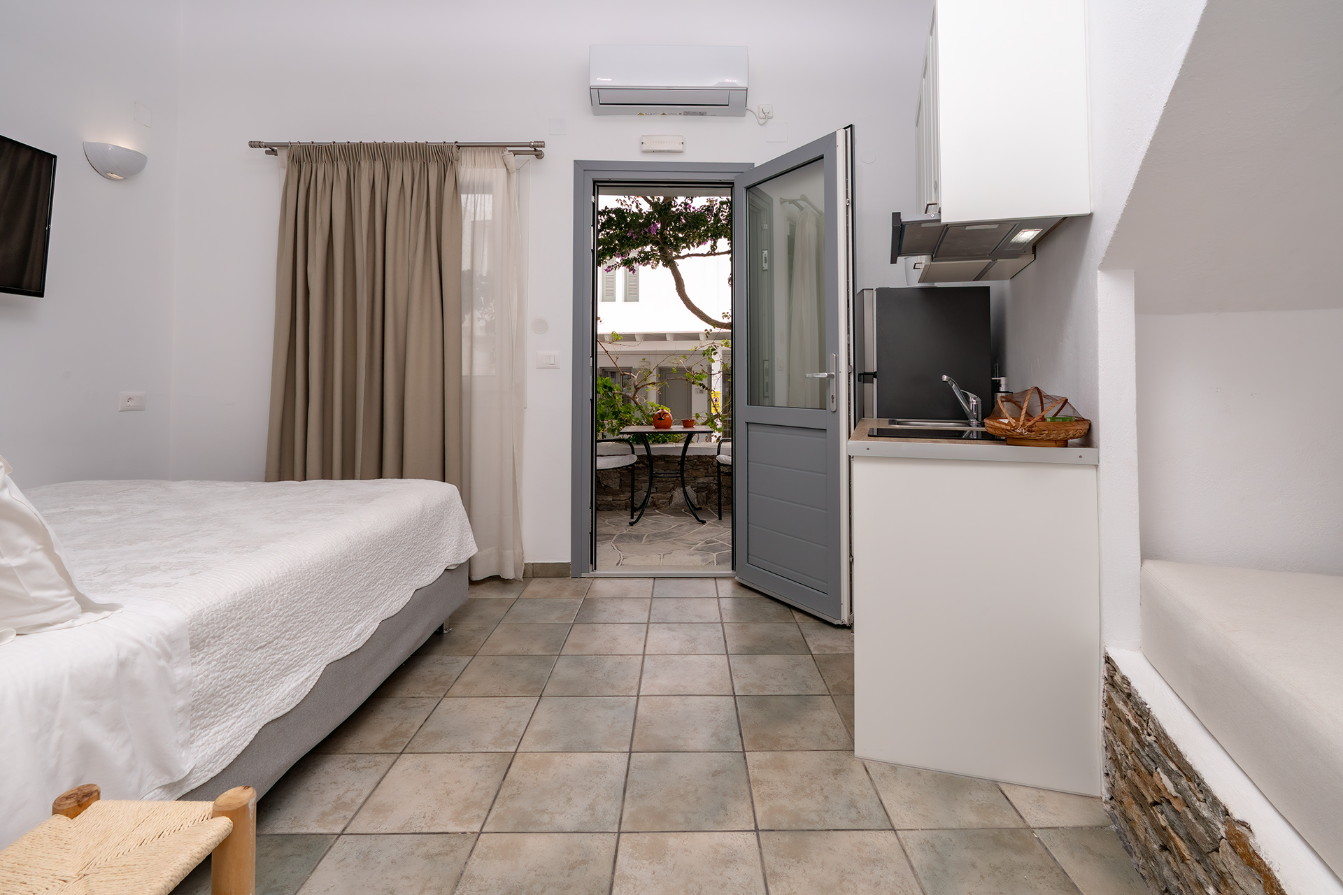 PENSION AKROGIALI offer triple studio that offer our guests a comfortable stay. They are all spacious and furnished with simplicity and elegance. They have a double iron bed and one single bed and all the necessary decorative elements that create a relaxing atmosphere.